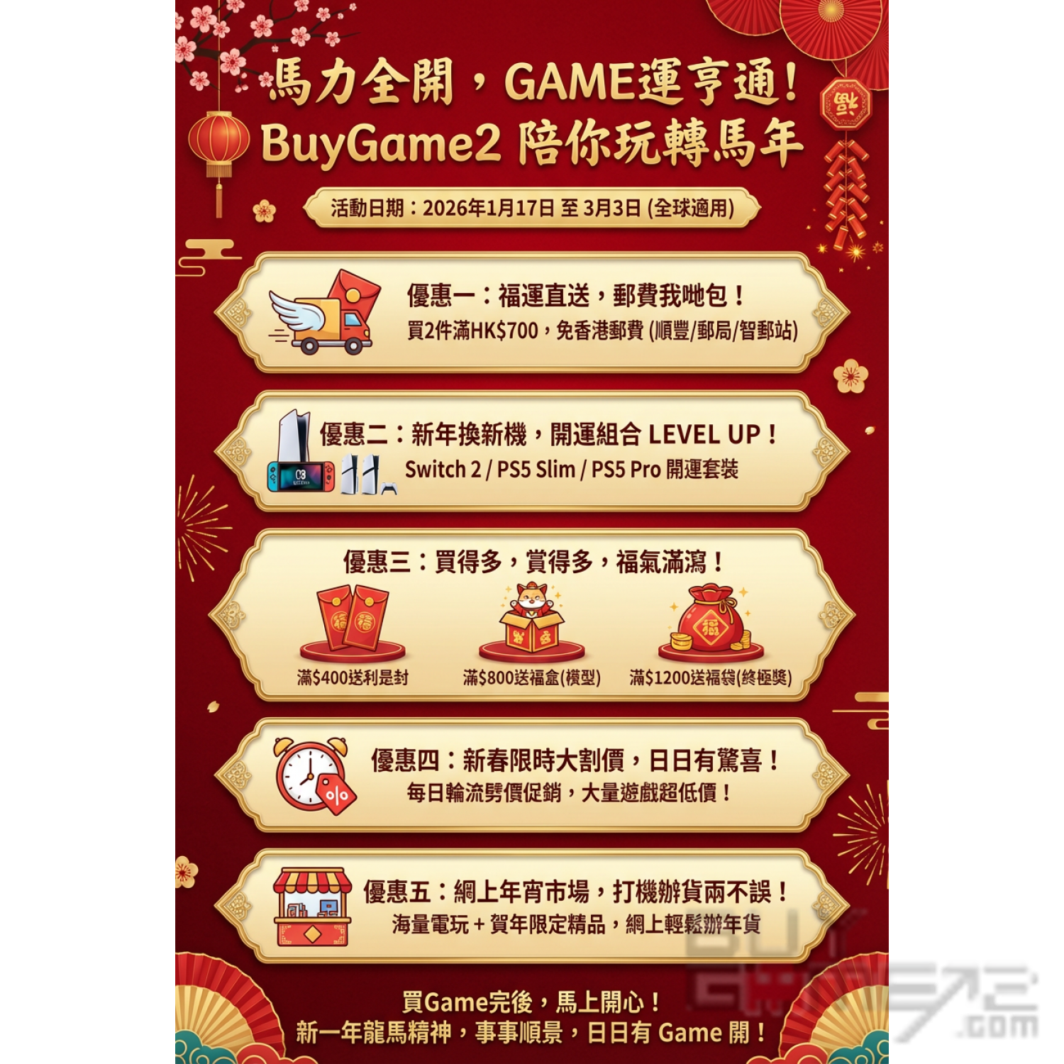 新年行大運,嚟 BuyGame2 消費,福氣帶返屋企!無論網店定門市,買滿指定金額即送你賀年好禮!